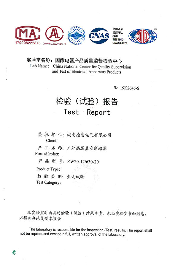 ZW20-12/630-20戶外高壓真空斷路器試驗報告