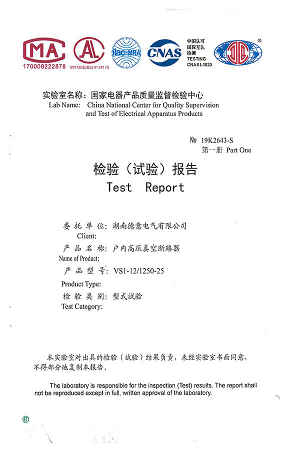 VS1-12/1250-25戶內(nèi)高壓真空斷路器試驗報告
